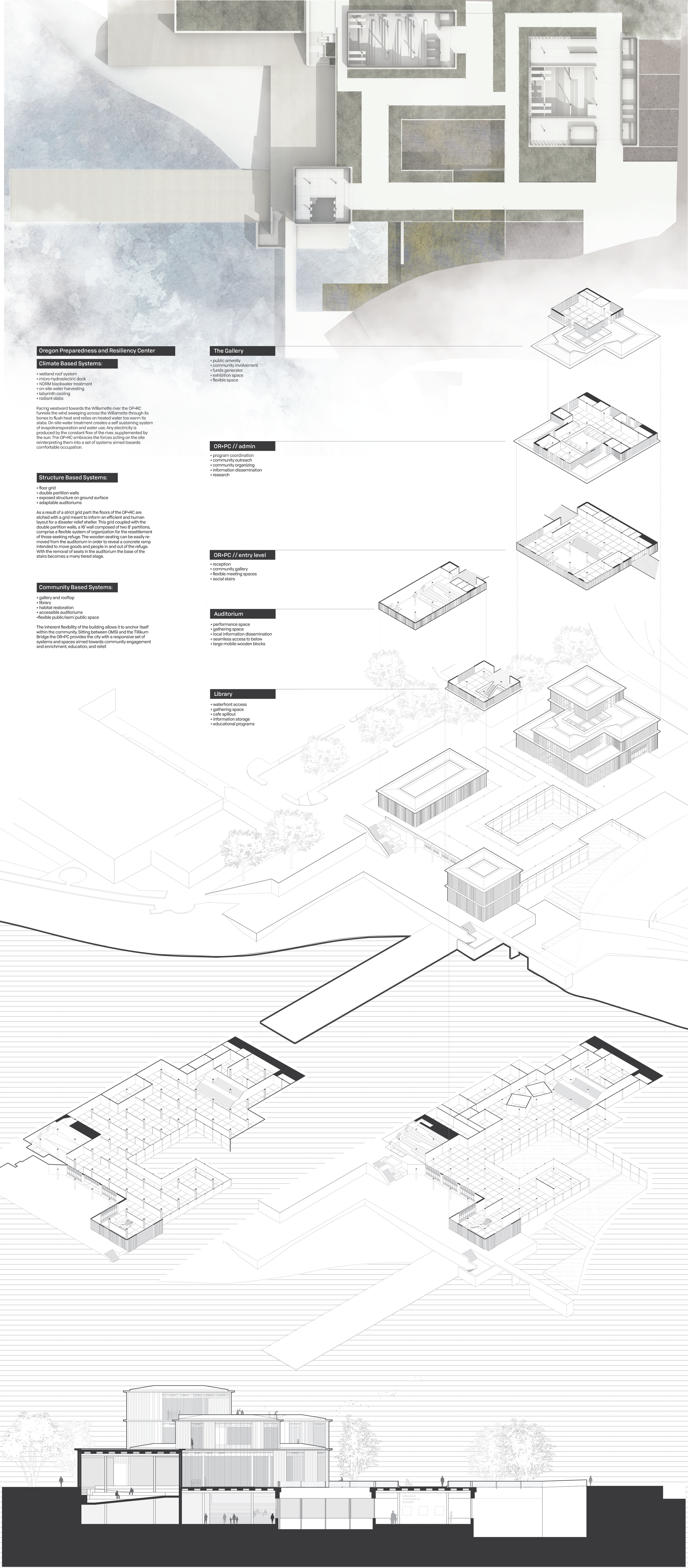 Situated snugly between the eastern end of the Tillikum Crossing and OMSI, the Oregon Resiliency and Preparedness Center, OR + PC for short, embraces the forces existing on the site: water, wind, light, time, and space reinterpreting them into an adaptive and flexible set of systems aimed towards education and relief. The project has two distinct lives, pre and post event.